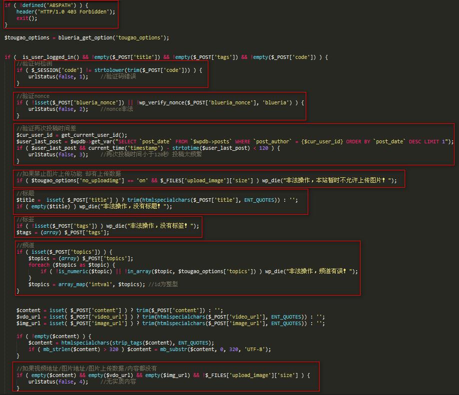 • 多重验证:投稿前js简单验证,防止投稿有误造成“垃圾稿”,也防止吓捣蛋;投稿提交后php多步验证,防止恶意投稿和稍微的黑客找网站切入口,看下图大概代码(每一步出错 投稿都会被终止)